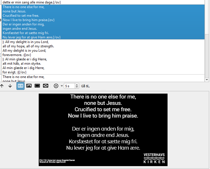 The line breaks are currently outside the formatting tags, which results in an empty line being displayed in the Stage View. To avoid that, you can include the line break within the formatting tag configuration and write both lines on a single line while editing the song.